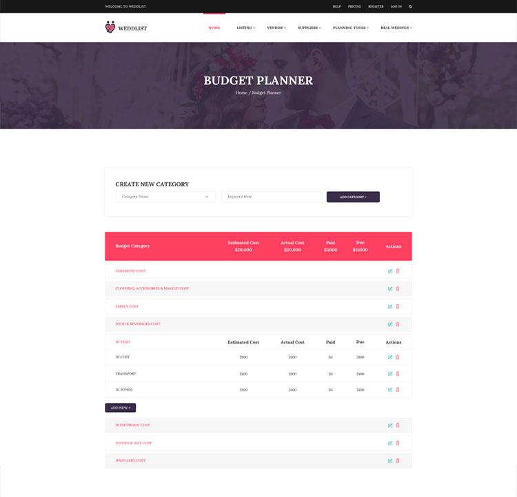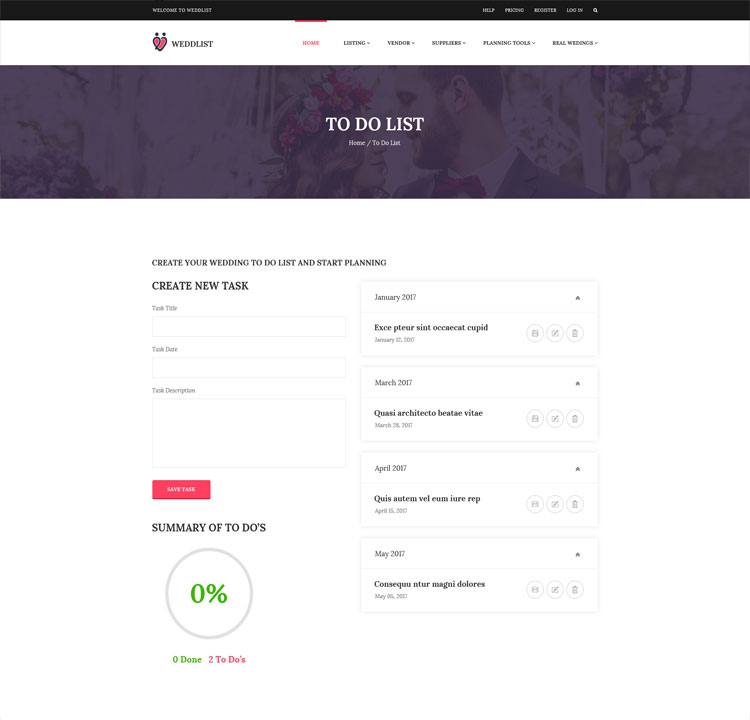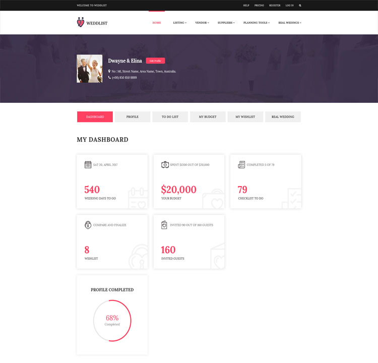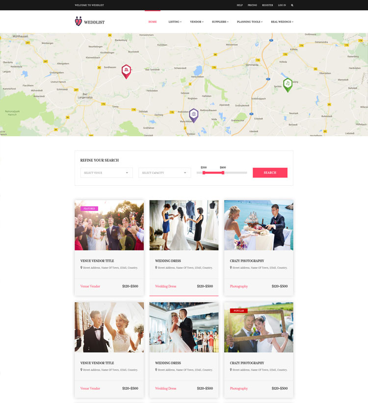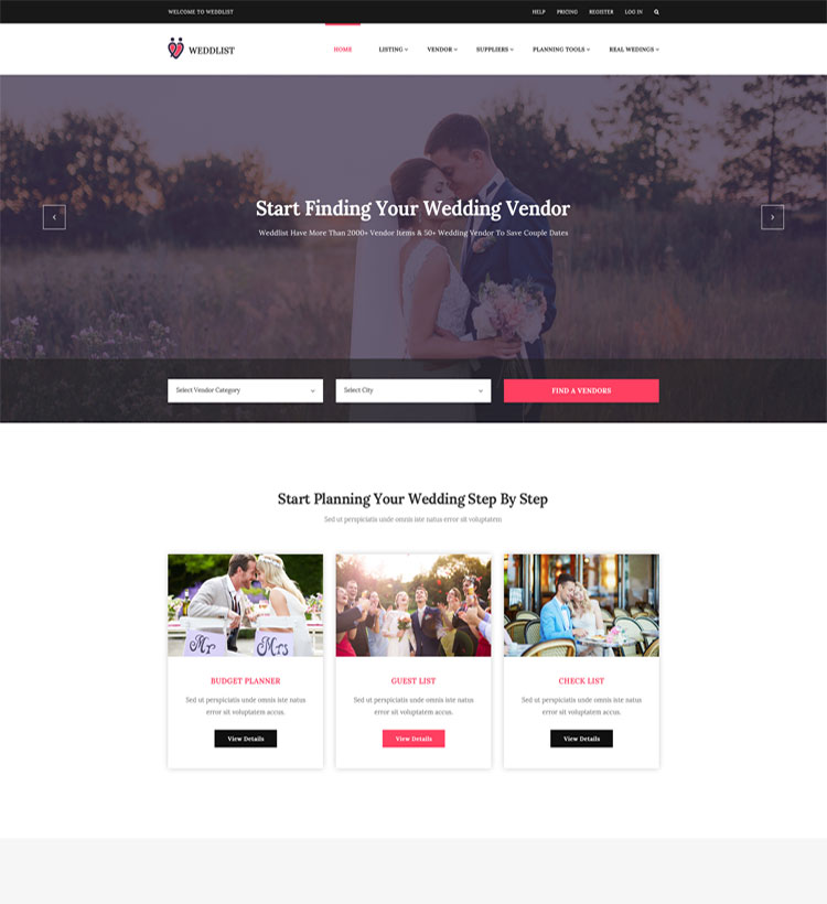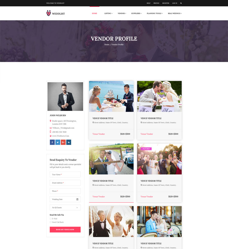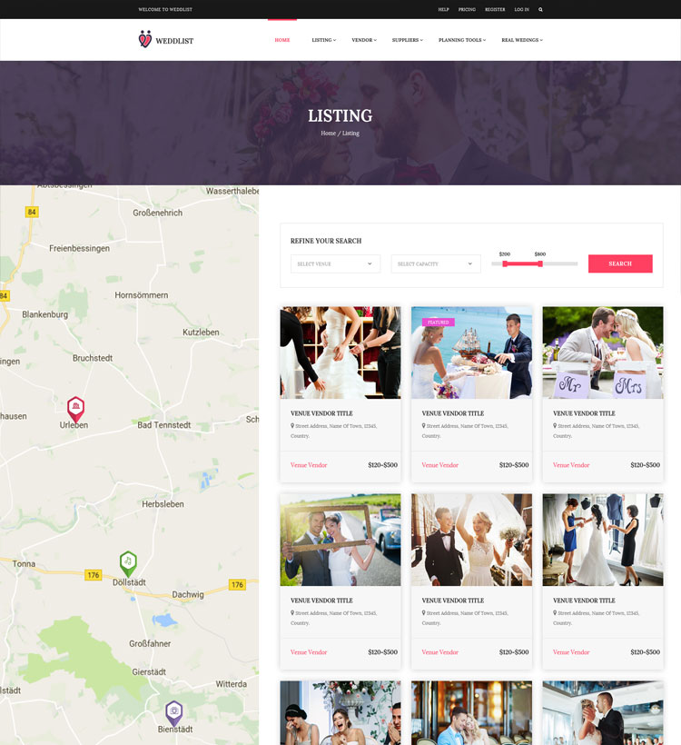 VIEW DEMO Purchase NowWeddlist is a professional wedding vendor directory template designed for wedding supplier and couples.Weddlist Template that is suitable for all your Wedding Directory & Wedding Vendor. In which we included total HTML files that can be customized easily.