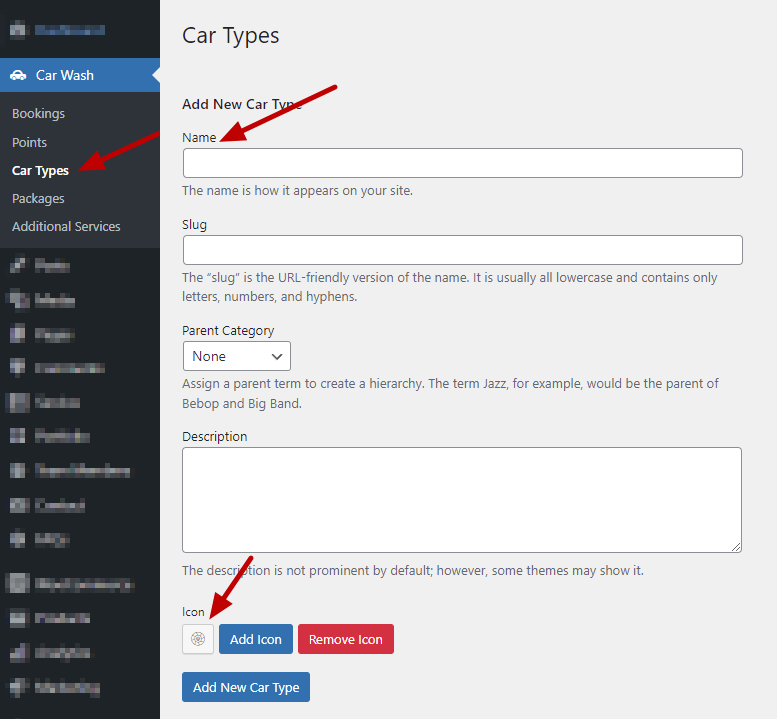 Add Car Type Name and Icon, the slug will will be created automatically while you click on Add New Car Type.