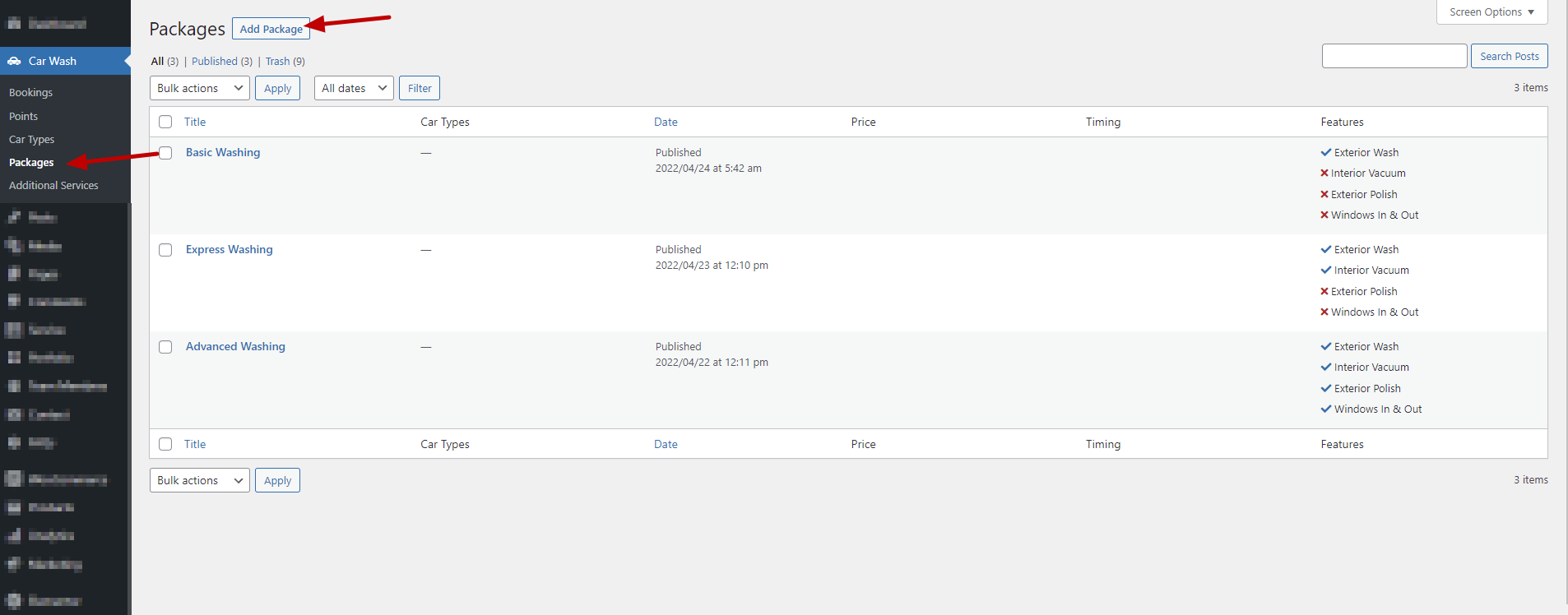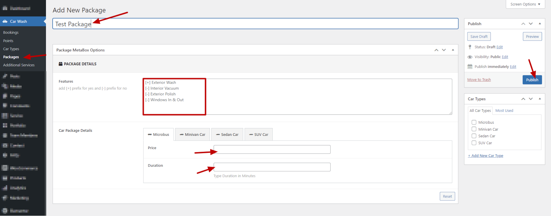 After that add Price and Duration of Package for every Car types. These Fields are Required in order to Publish/Update the Package.