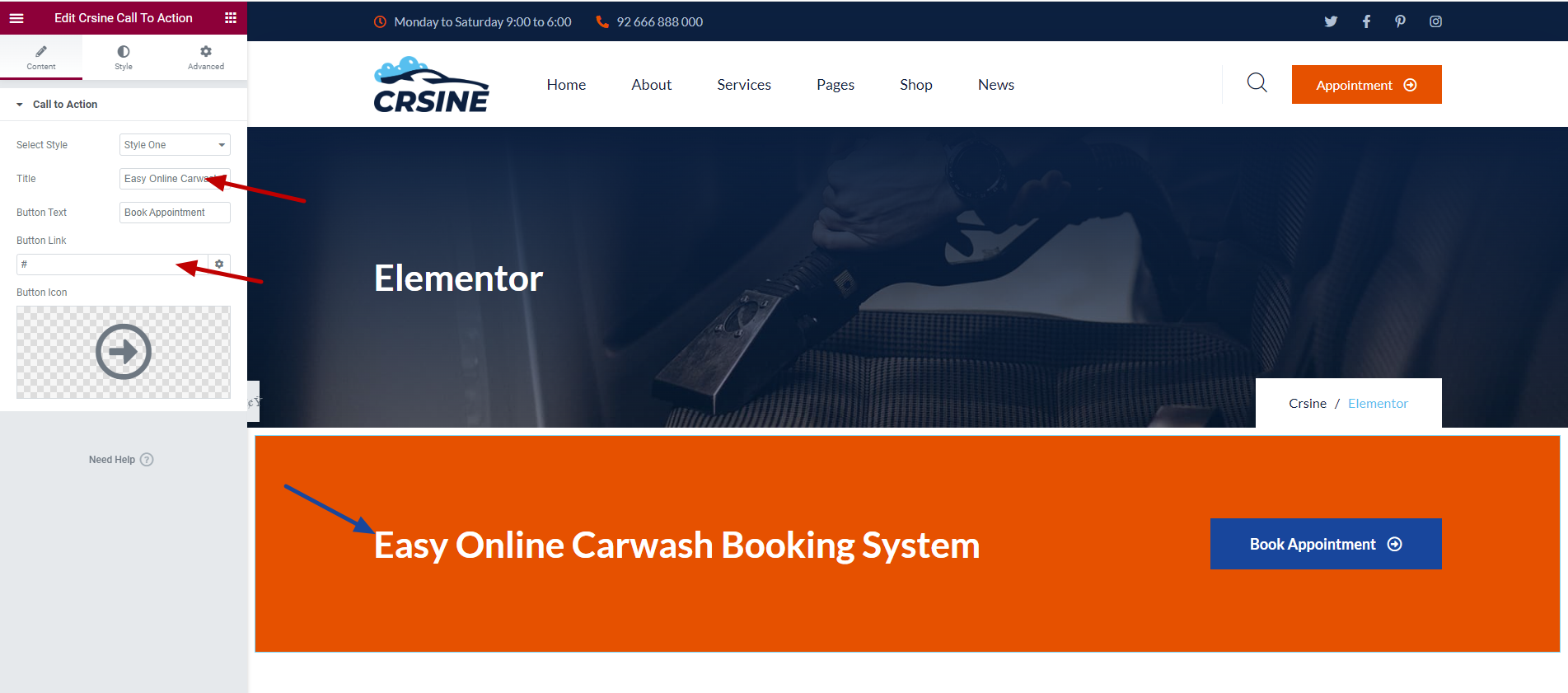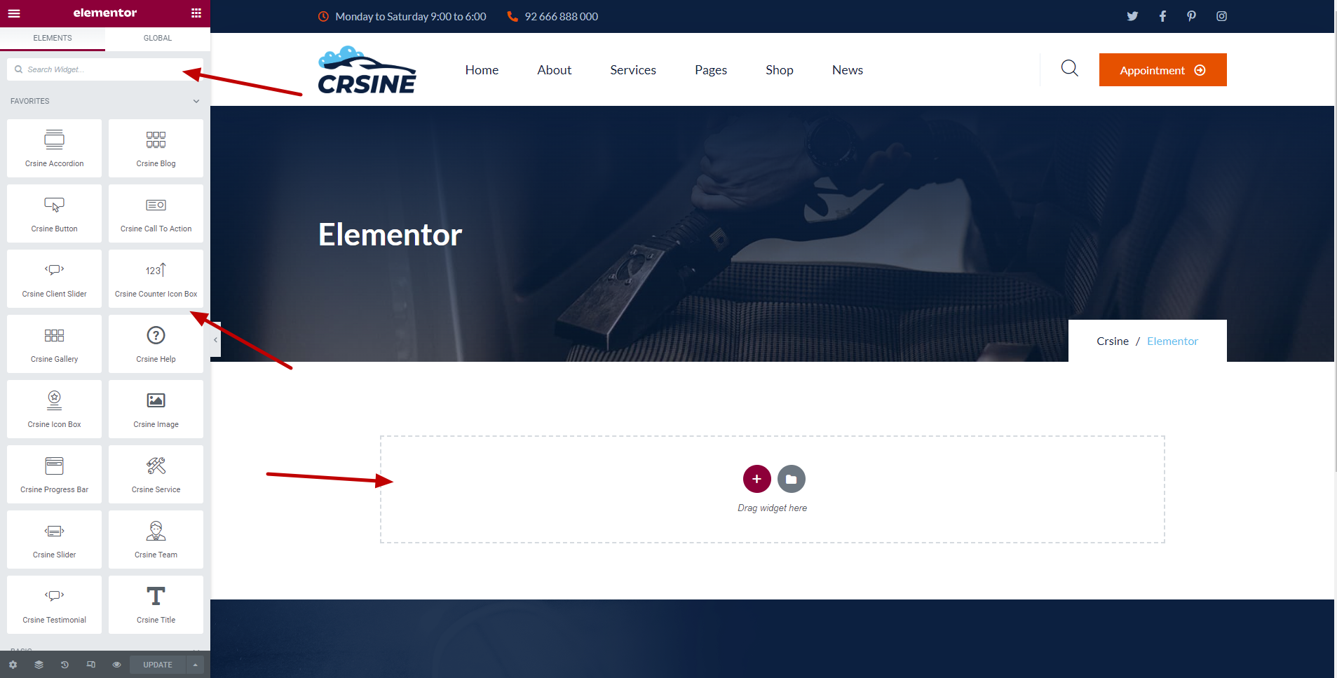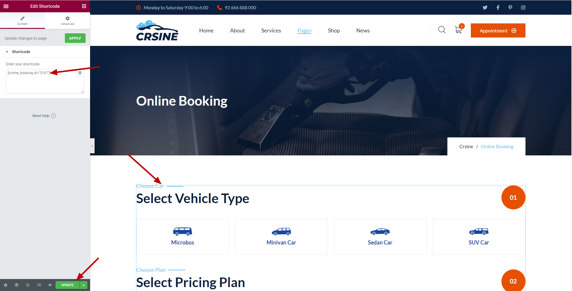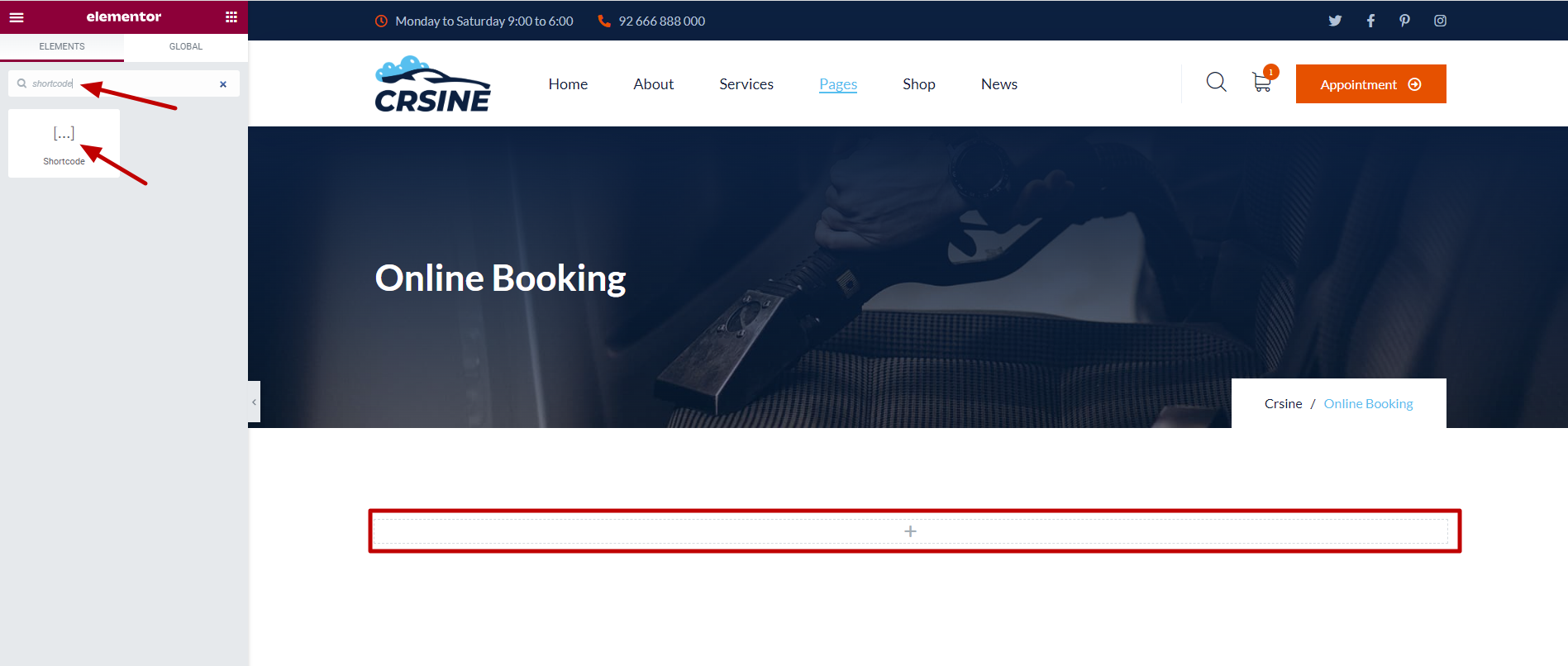 While Creating an Online Booking Page, copy your Point's Shortcode. Then Create a new Page and edit it with Elementor. Serach for Shortcode as shown below and drag and drop it on highlighted area.