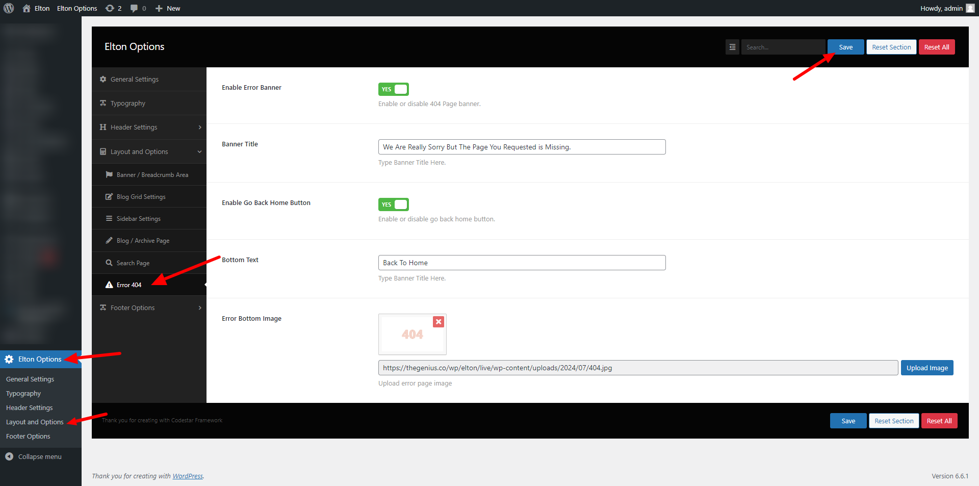 wp-admin >> elton Options >> Layout and Options >> Error 404