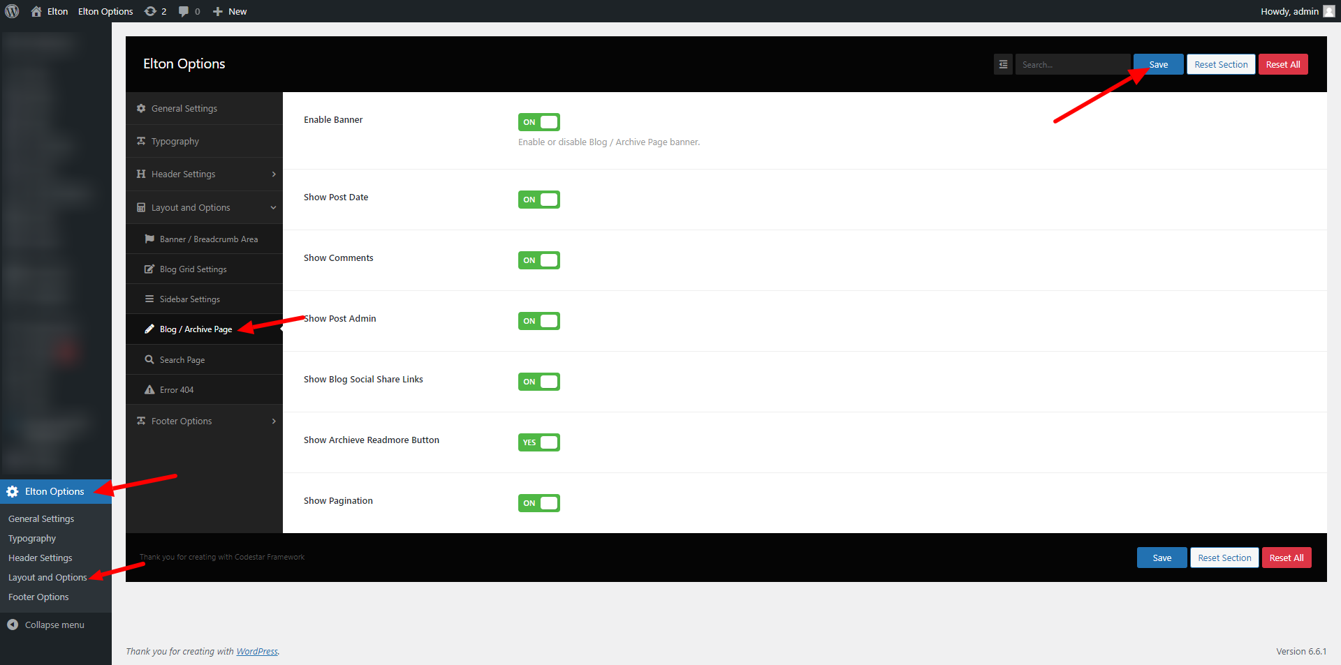 wp-admin >> elton Options >> Layout and Options >> Blog/ Archive Page