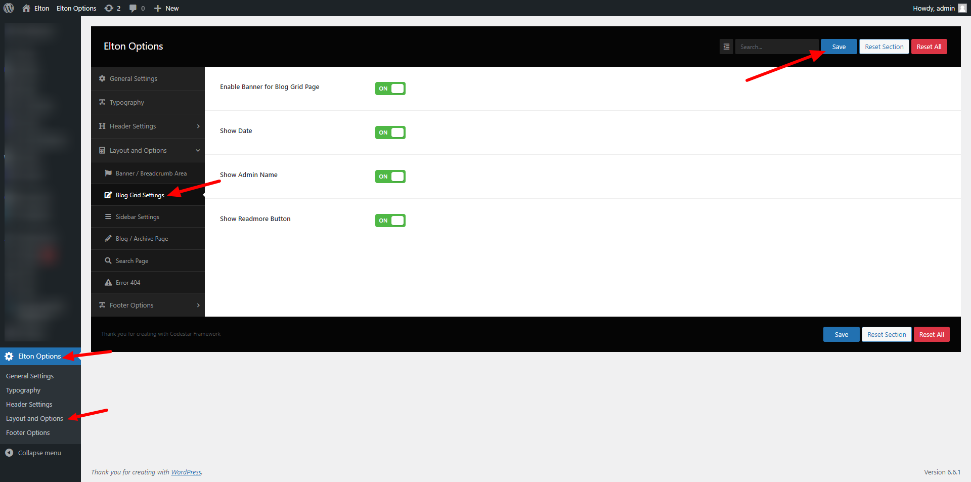 wp-admin >> elton Options >> Layout and Options >> Blog Grid Settings
