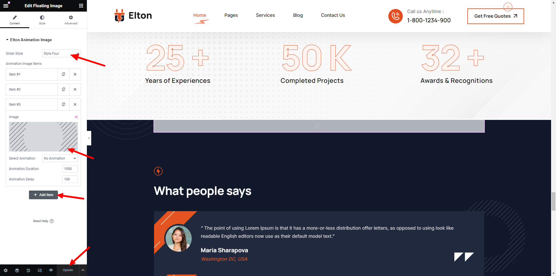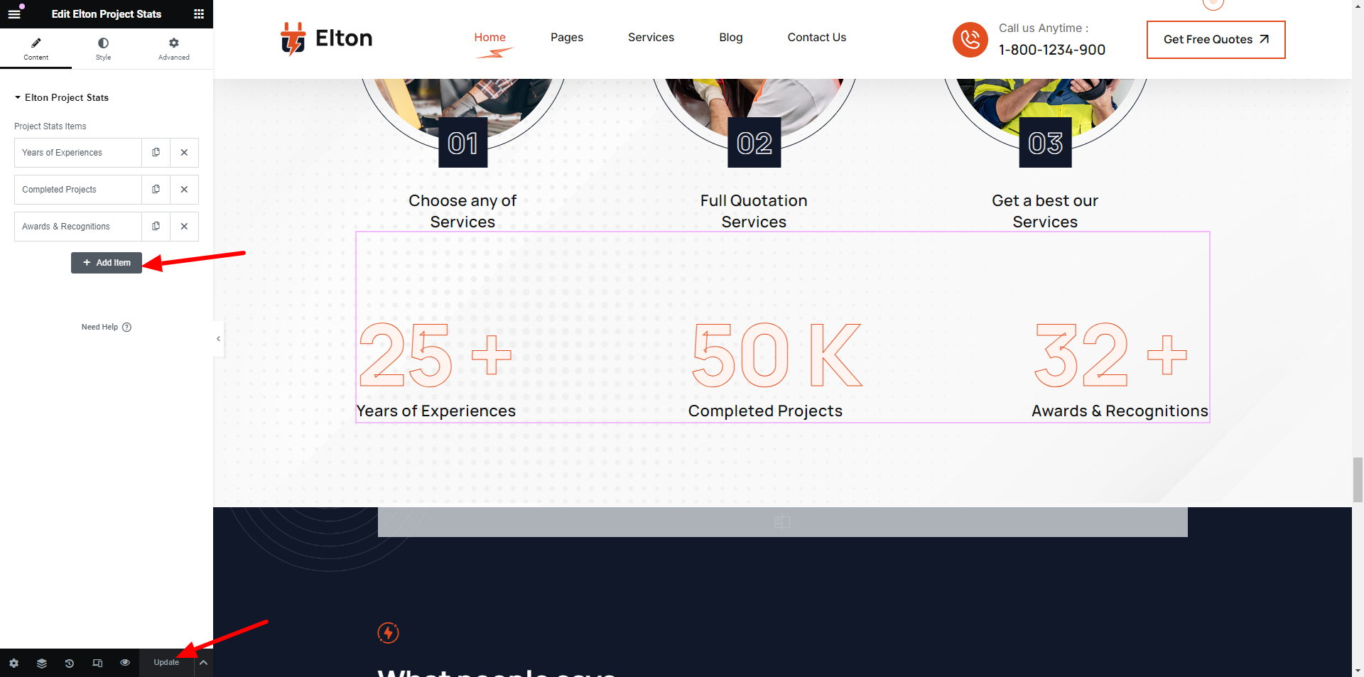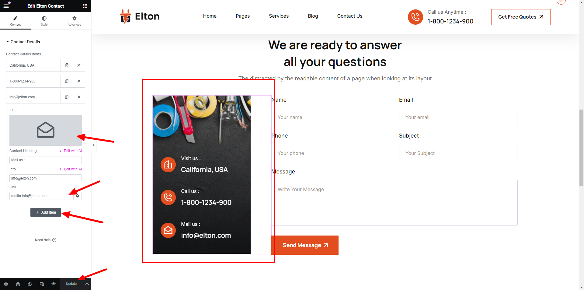 Add number,icon and text to the Contact Section.
