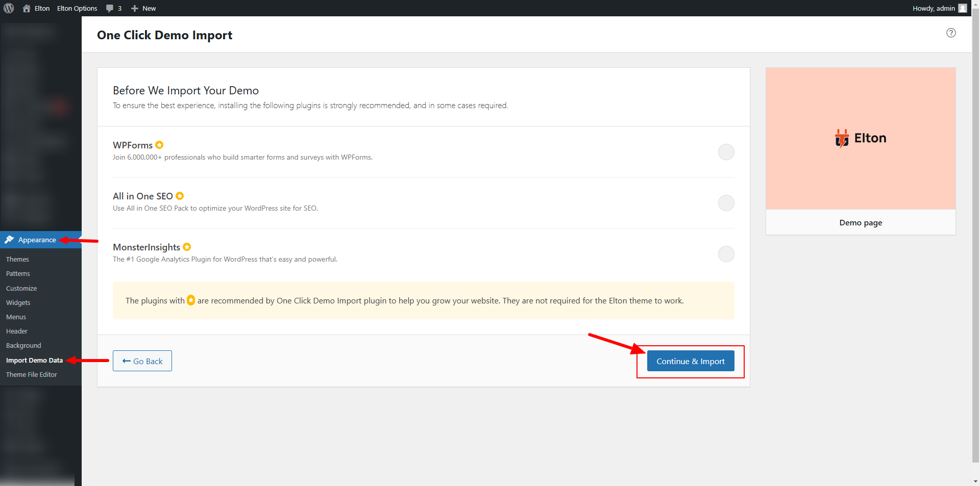 After clicking on "Import Demo Data," select "Continue & Import" and wait for a moment. Avoid refreshing the page or using the back button.