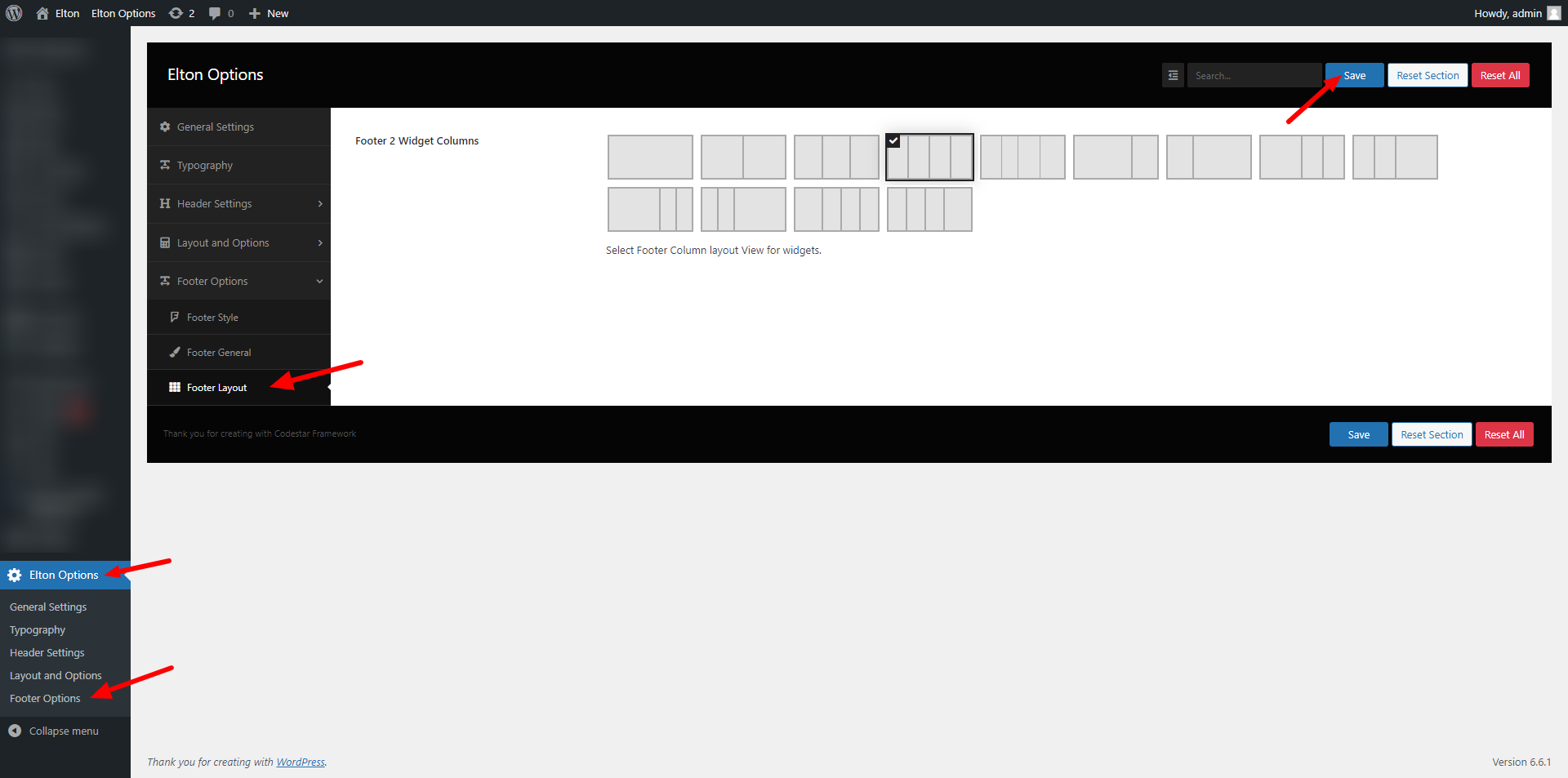 wp-admin >> elton Options >> Footer Options >> Footer Layout