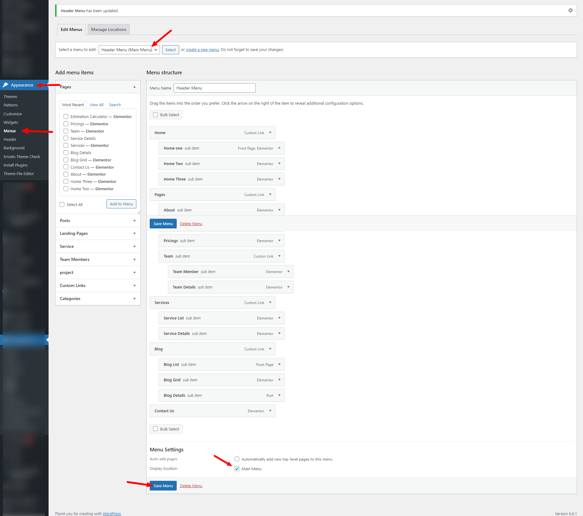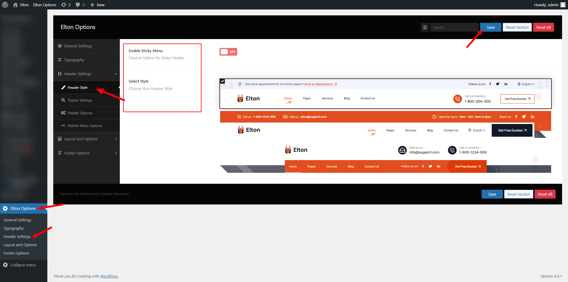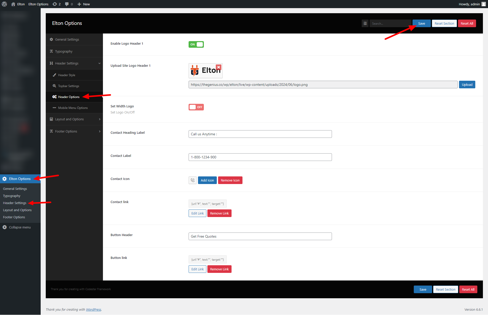 wp-admin >> elton Options >> Header Settings >> Header Options