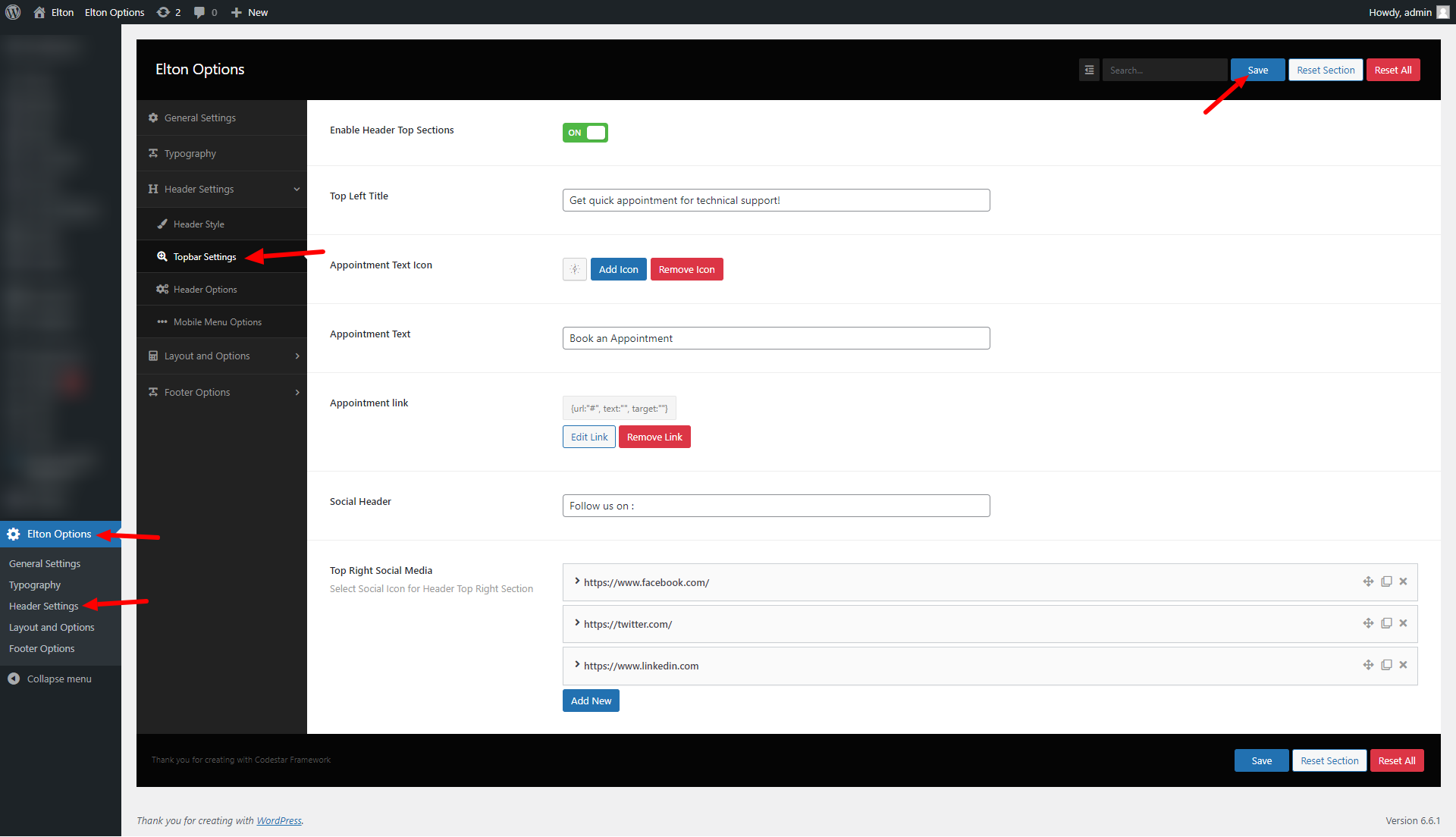 wp-admin >> elton Options >> Header Settings >> Topbar Settings
