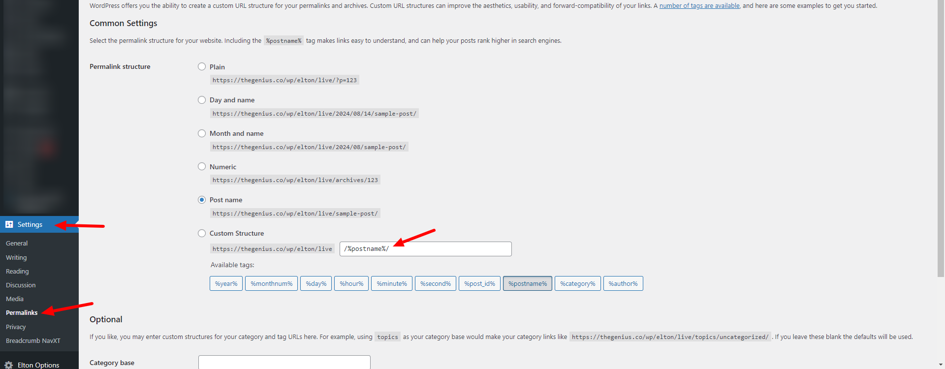 wp-admin >> elton Options >> General Settings