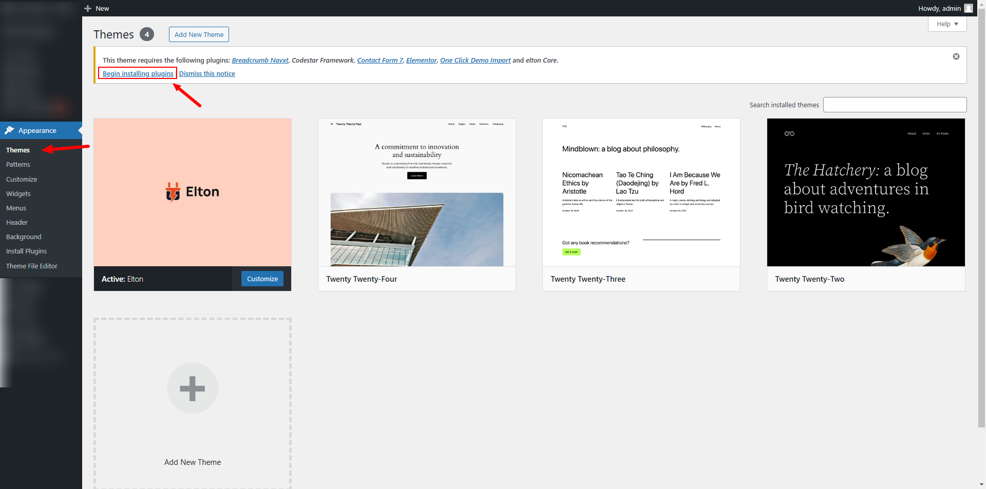 Go to Admin panel > Appearance > Themes > Click On 'Begin installing plugins'