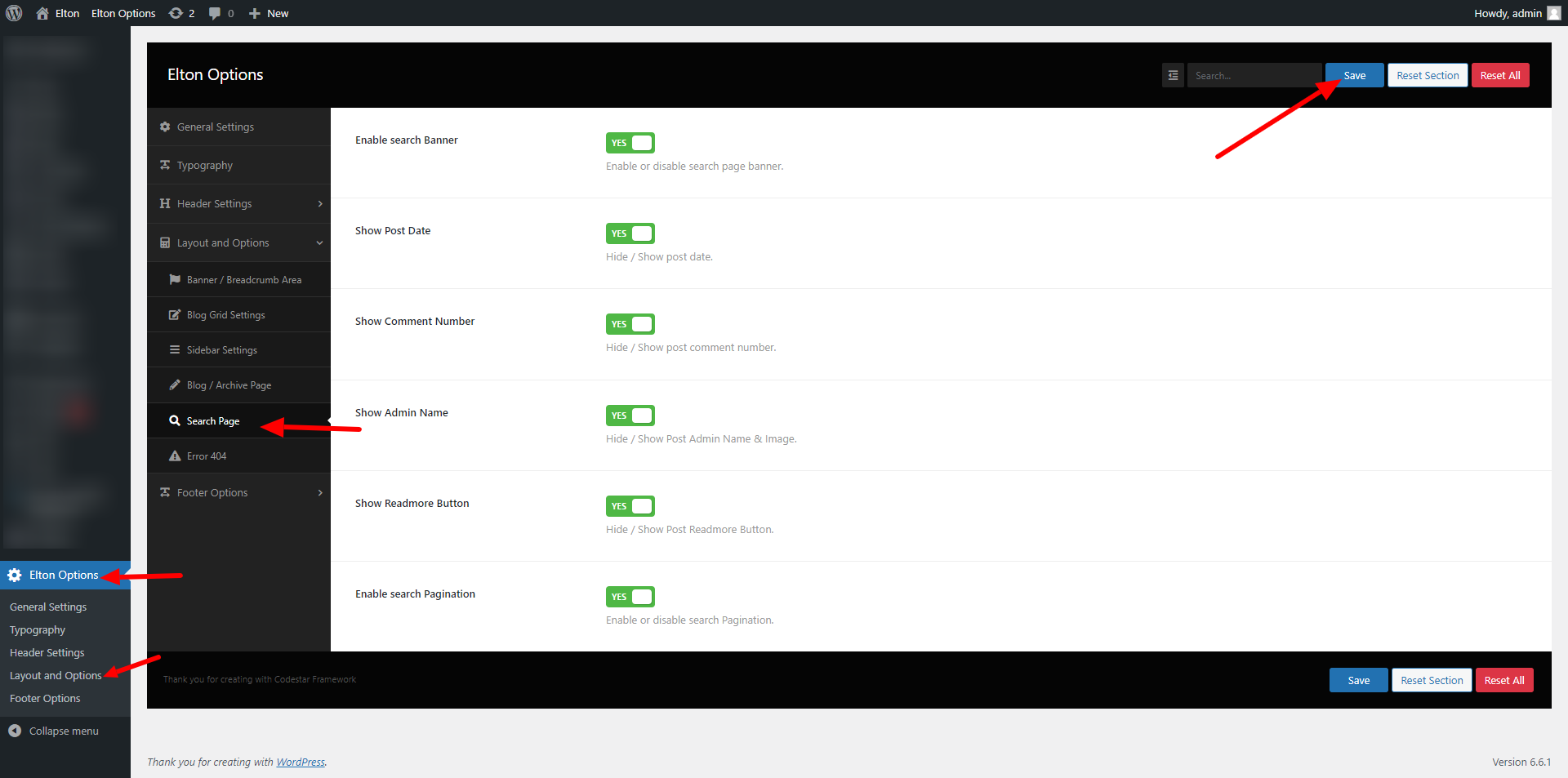 wp-admin >> elton Options >> Layout and Options >> Search Page