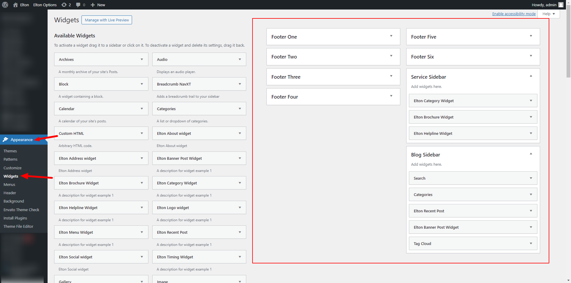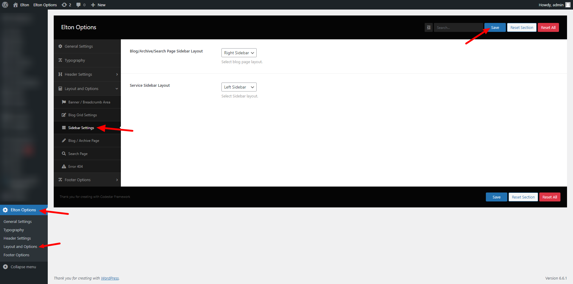 wp-admin >> elton Options >> Layout and Options >> Sidebar Settings