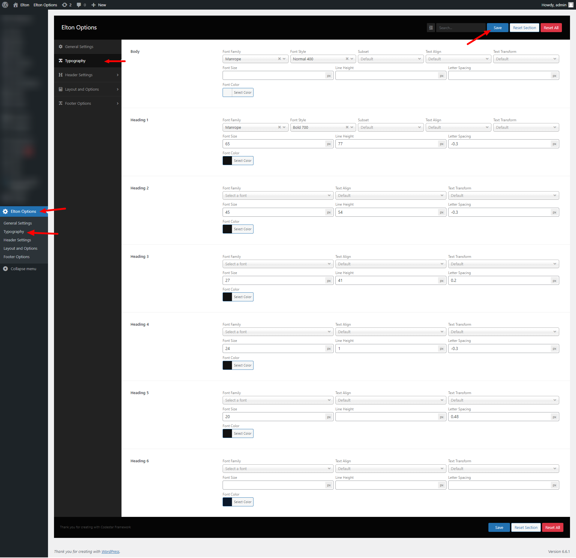 wp-admin >> elton Options >> Typography