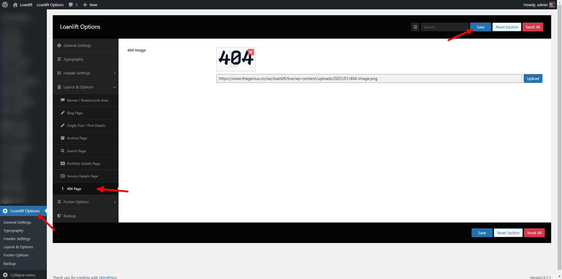 wp-admin >> loanlift Options >> Layout and Options >> 404 Page