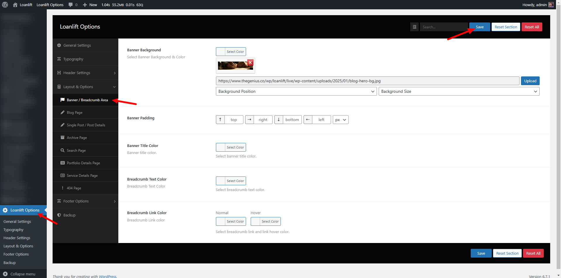 wp-admin >> loanlift Options >> Layout and Options >> Banner / Breadcrumb Area