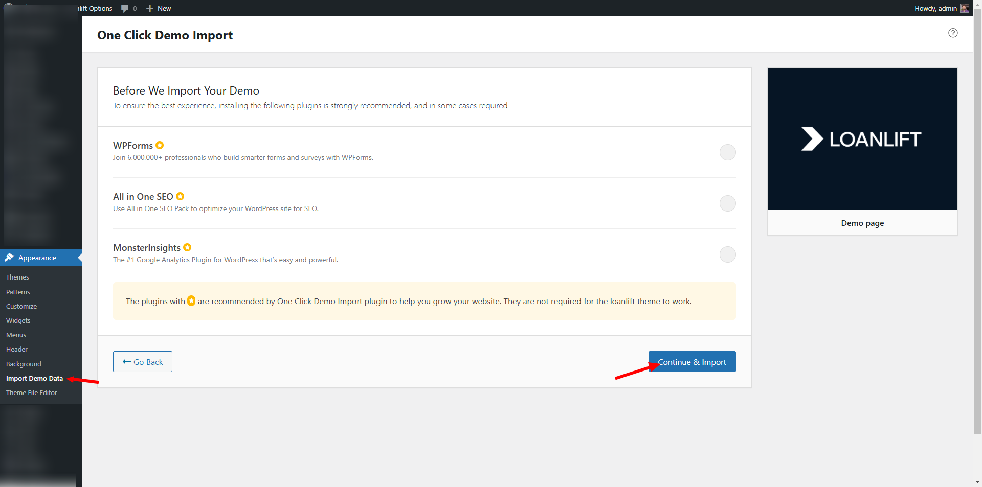 After clicking on "Import Demo Data," select "Continue & Import" and wait for a moment. Avoid refreshing the page or using the back button.