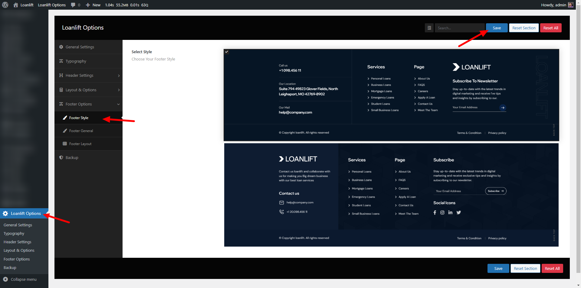 wp-admin >> loanlift Options >> Footer Options >> Footer Style