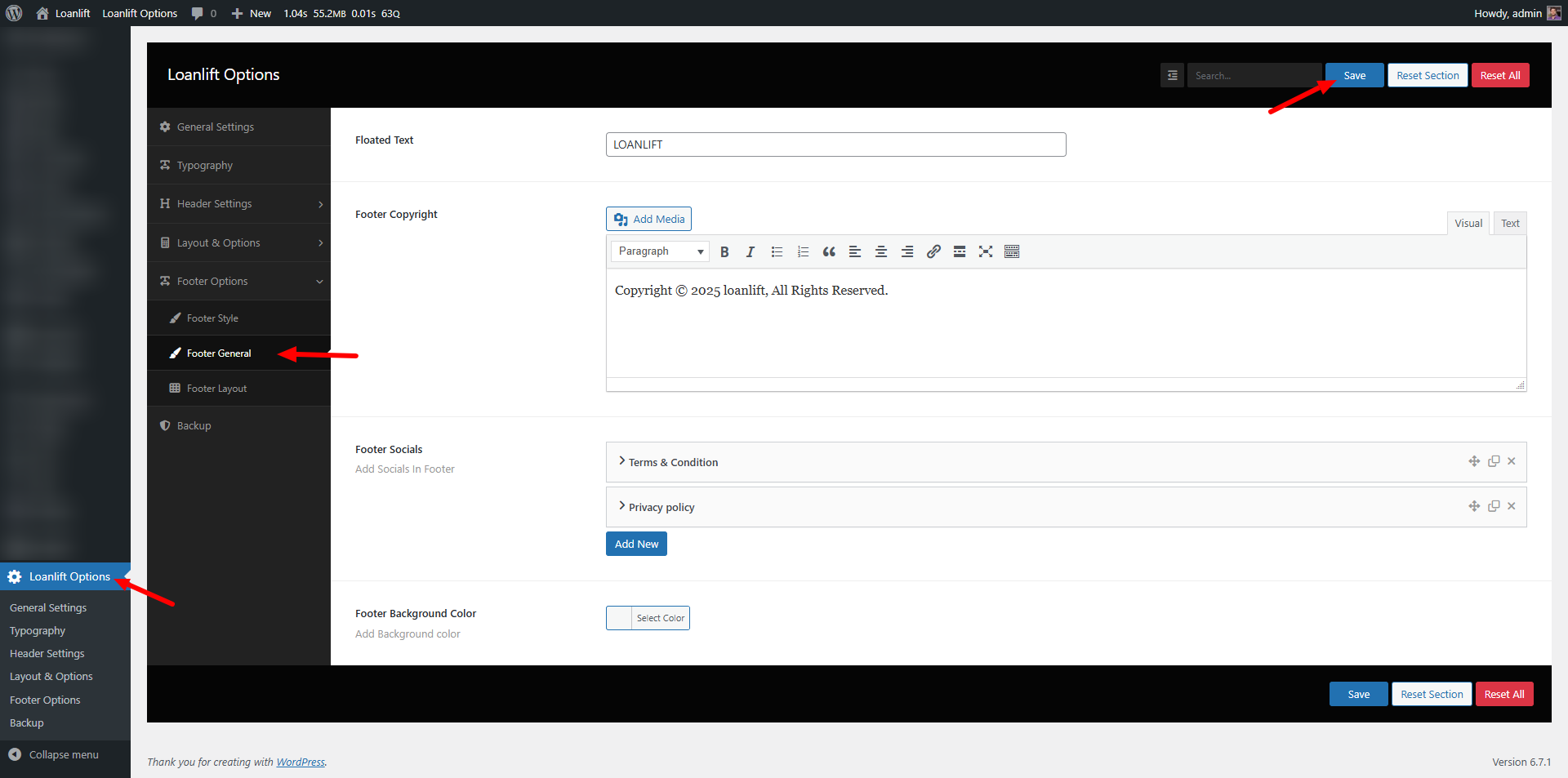 wp-admin >> loanlift Options >> Footer Options >> Footer General