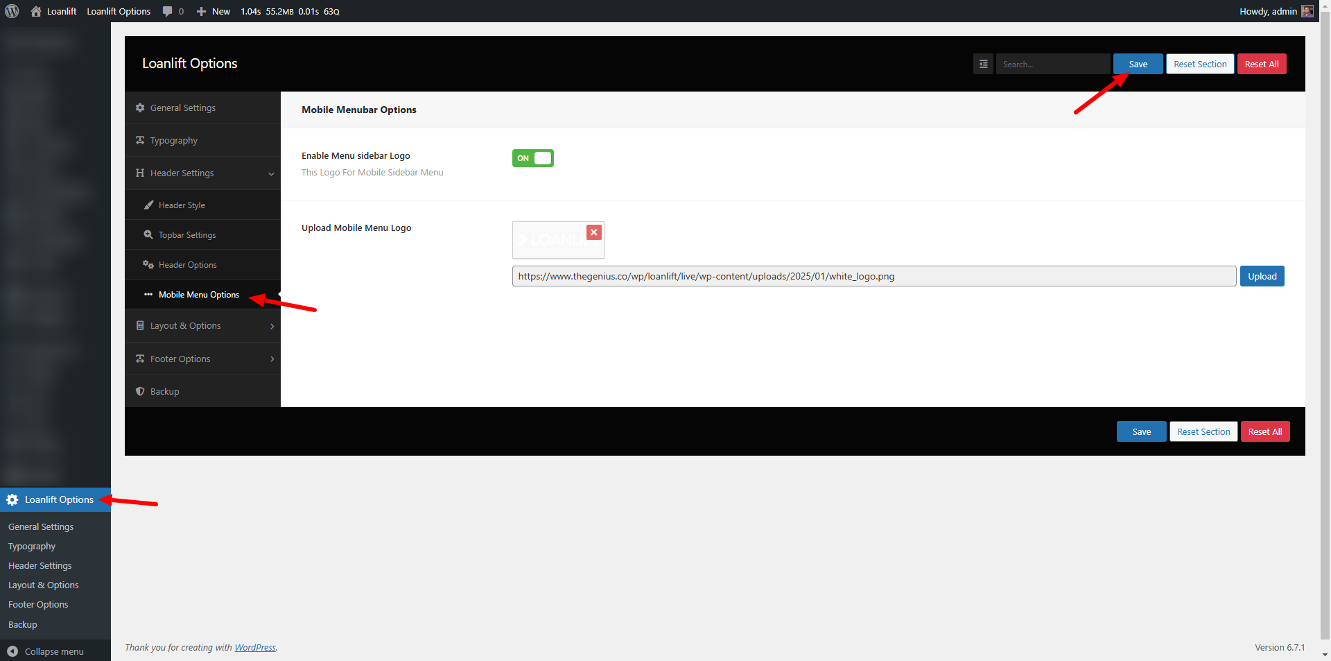 wp-admin >> loanlift Options >> Header Settings >> Mobile Menu Options