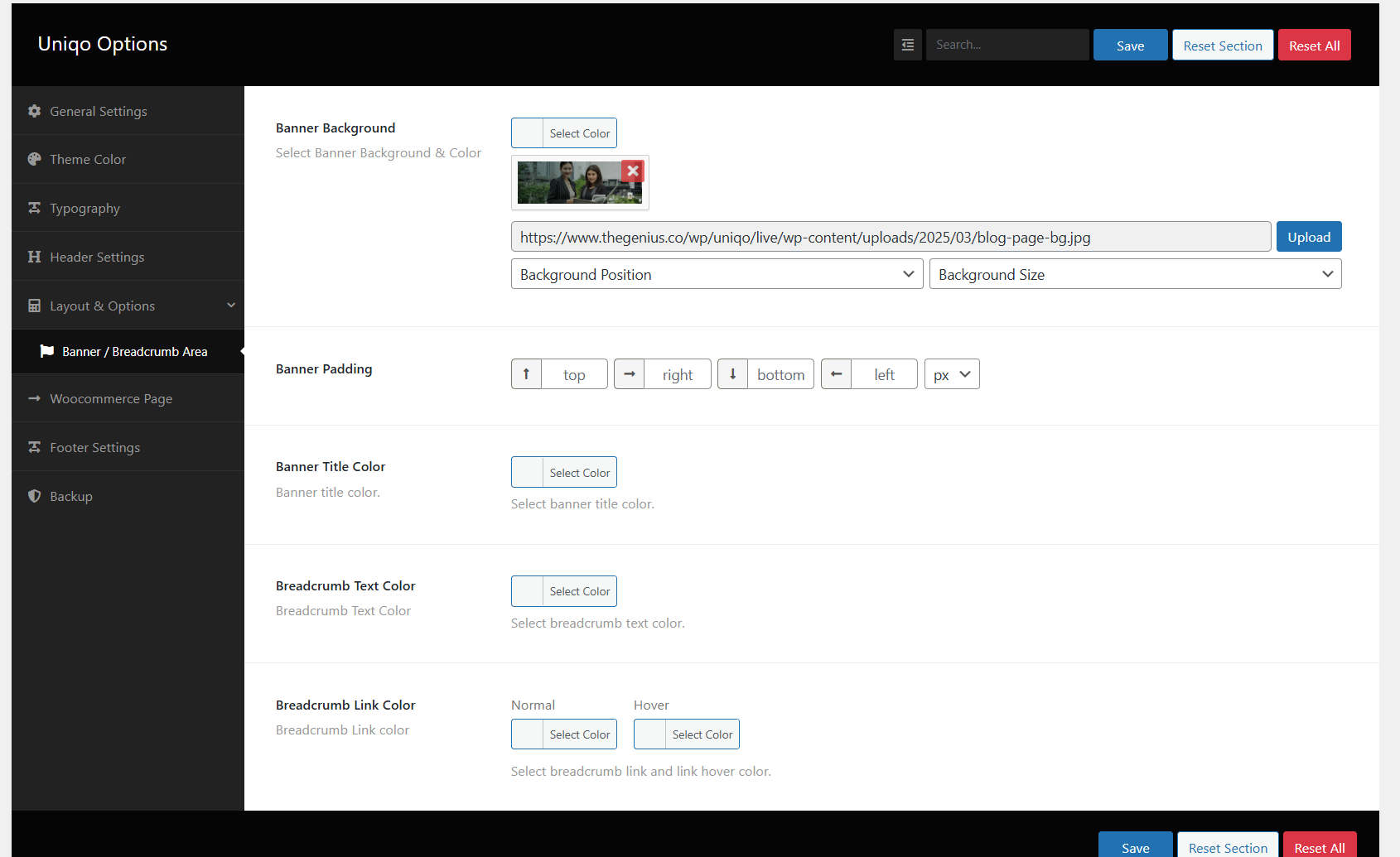 wp-admin >> Uniqo Options >> Layout and Options >> Banner / Breadcrumb Area