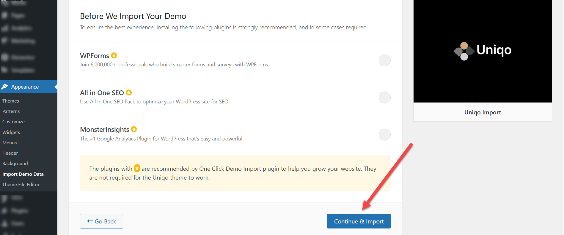 After clicking on "Import Demo Data," select "Continue & Import" and wait for a moment. Avoid refreshing the page or using the back button.