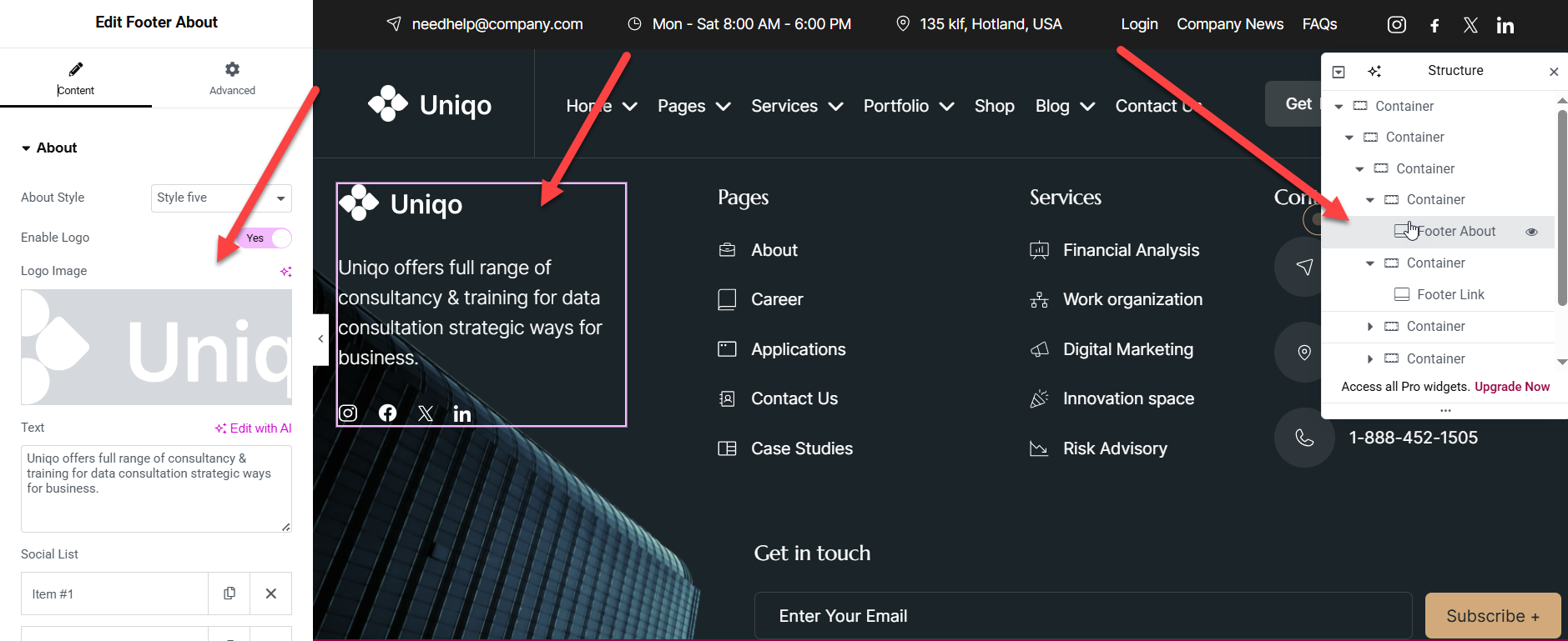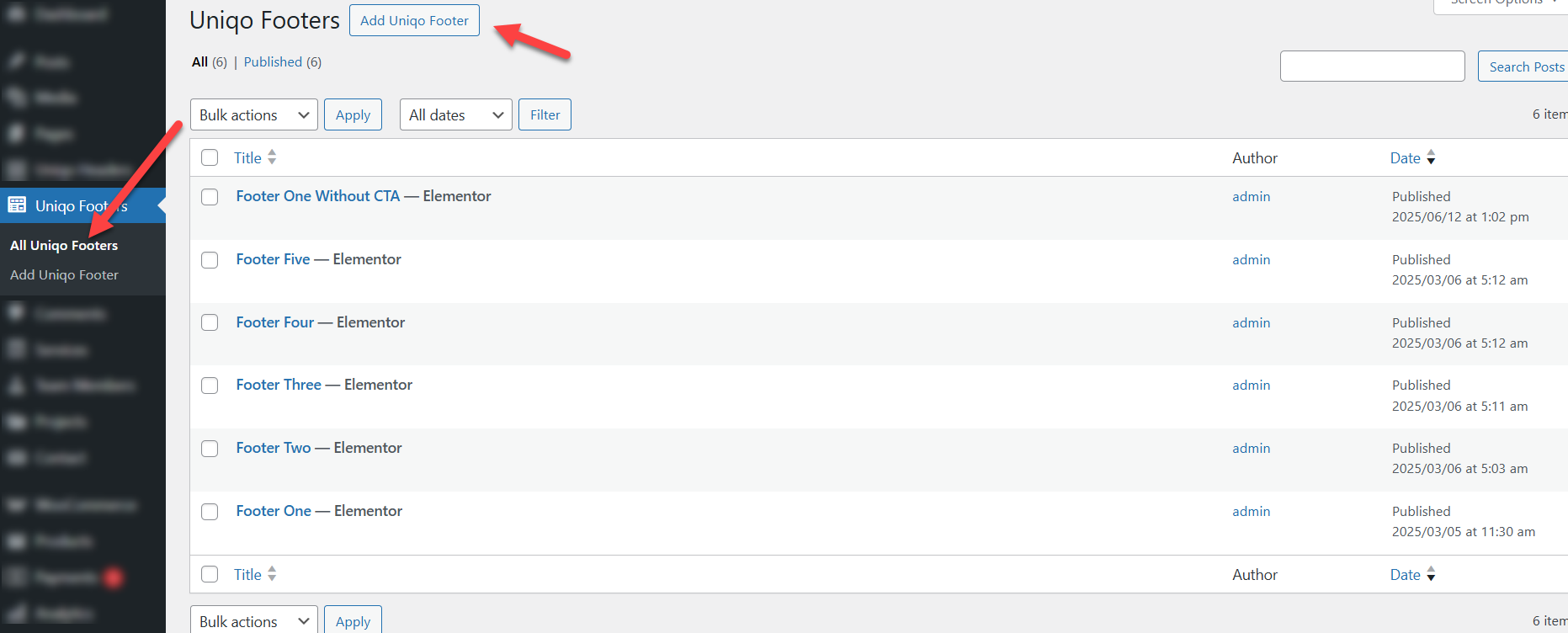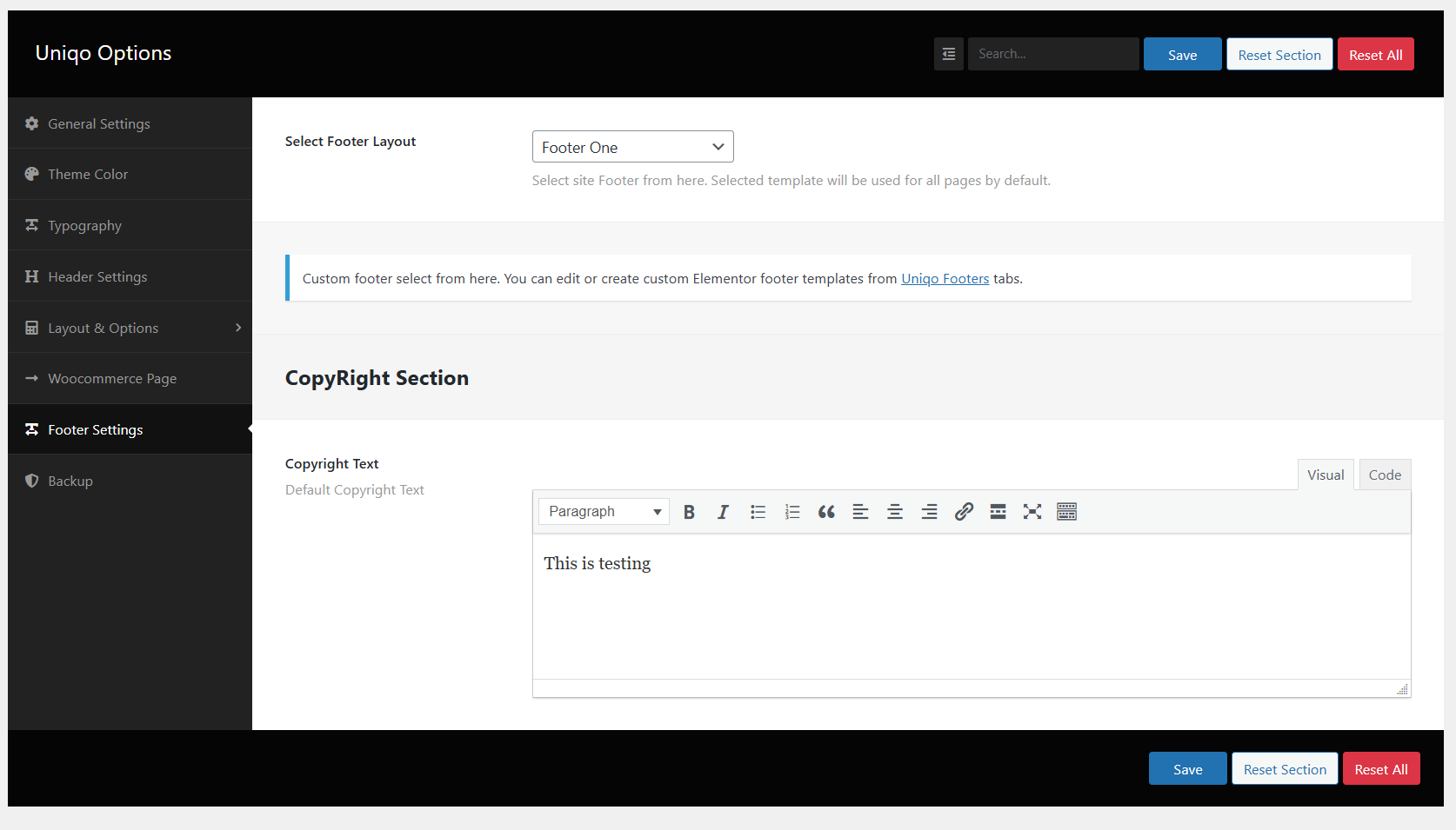 wp-admin >> Uniqo Options >> Footer Settings