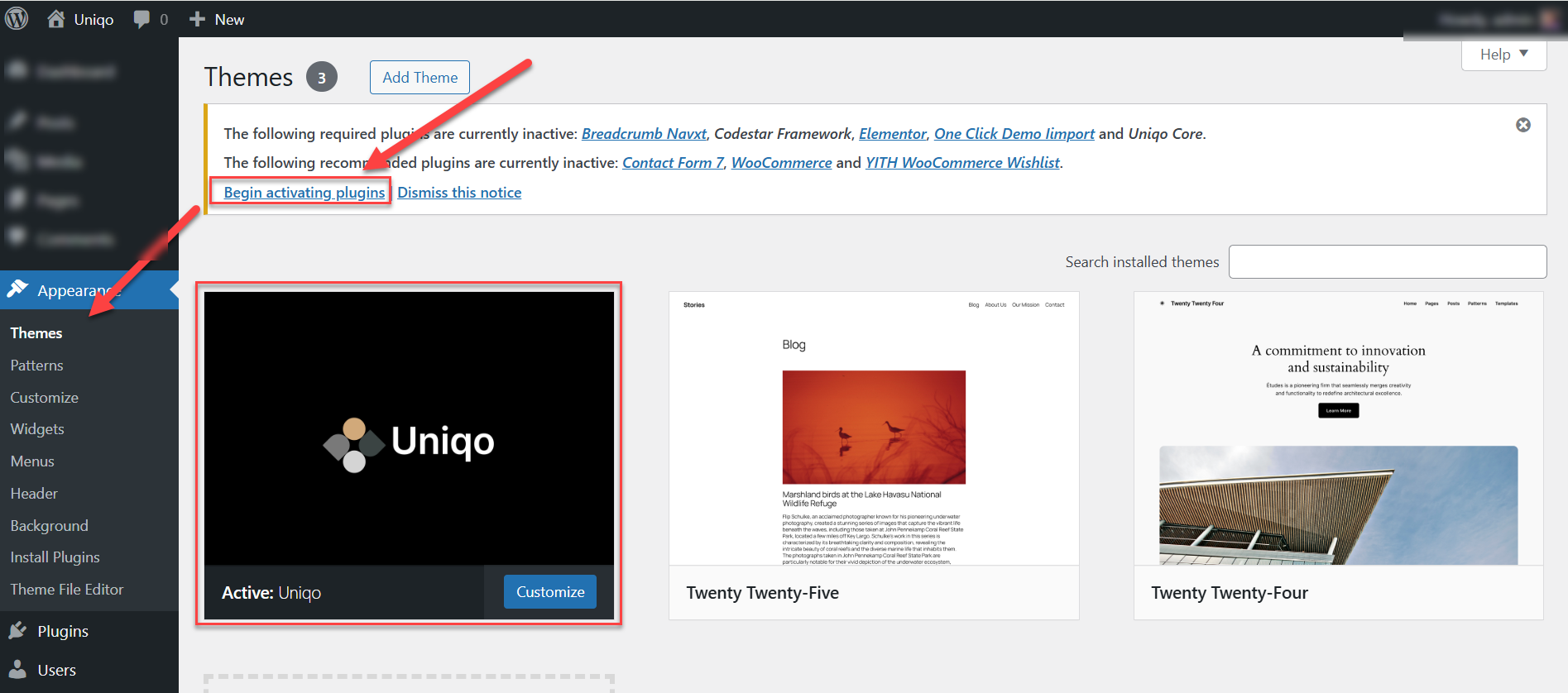 uniqodirectory to themes directory on remote server. - Once uploaded, navigate to Dashboard > Appearance > Themes in the WordPress Dashboard and hit Activate below your newly uploaded theme.