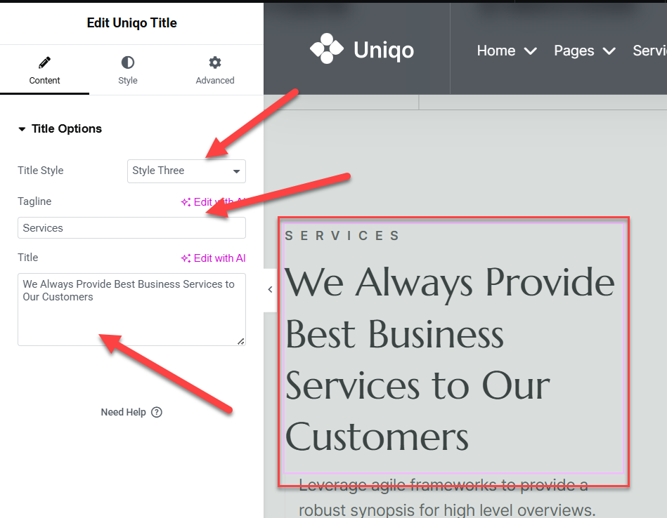 Give Title and tagline as you want. It will Reflect in output in elementor.