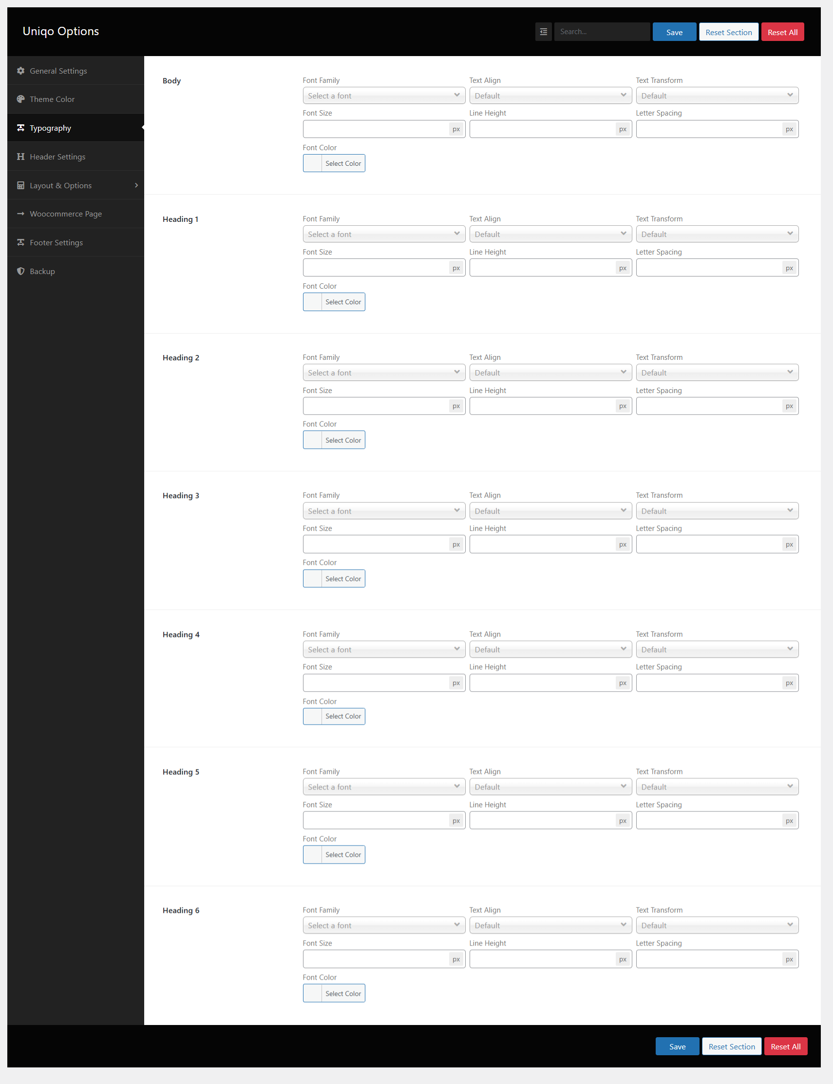 wp-admin >> Uniqo Options >> Typography