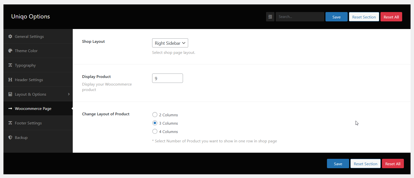 wp-admin >> Uniqo Options >> Woocommerce Page